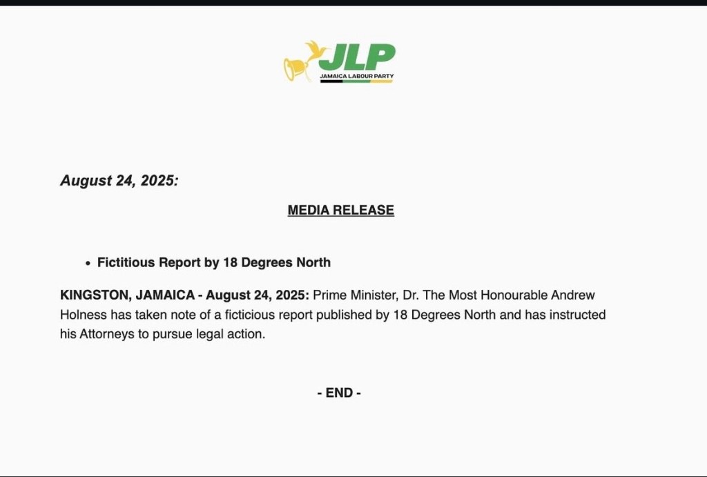 KINGSTON, Jamaica — The Jamaica Labour Party (JLP) has issued a media release and social media post declaring a report by the investigative journalism outlet 18 Degrees North to be “fictitious.” The statement, promoted through a paid partnership, came just hours after the report was published on the outlet’s subscriber-only platform.