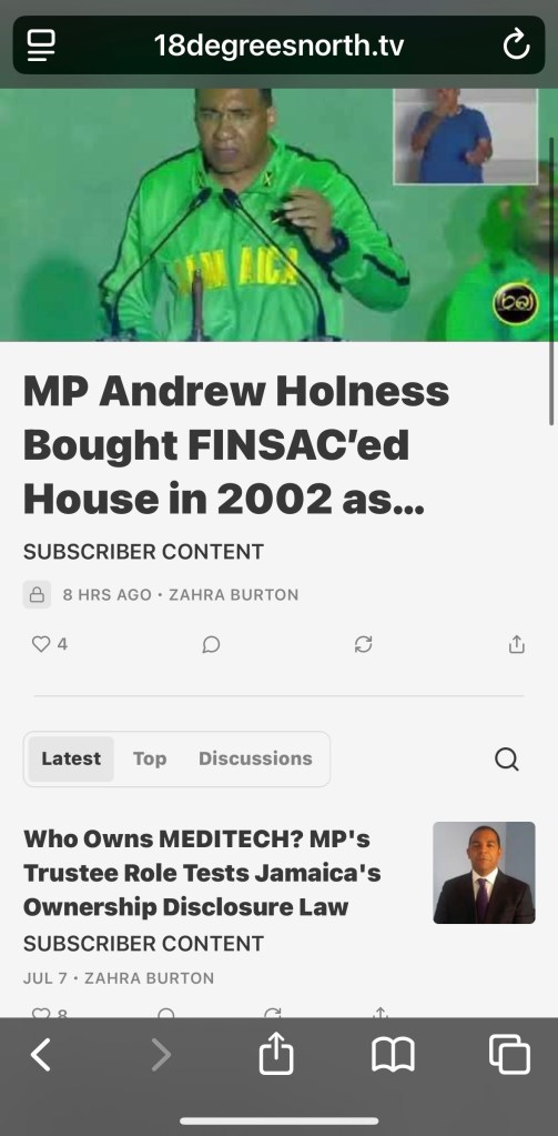 However, the report itself, titled “MP Andrew Holness Bought FINSAC’ed House in 2002 as…,” was published today, August 24, and is only available to paid subscribers of 18 Degrees North. The fact that the content could be accessed without a subscription indicates that, while designated as a paid article, it was publicly accessible to some readers. This may explain how the JLP was able to respond so quickly to a report not yet in the public domain.